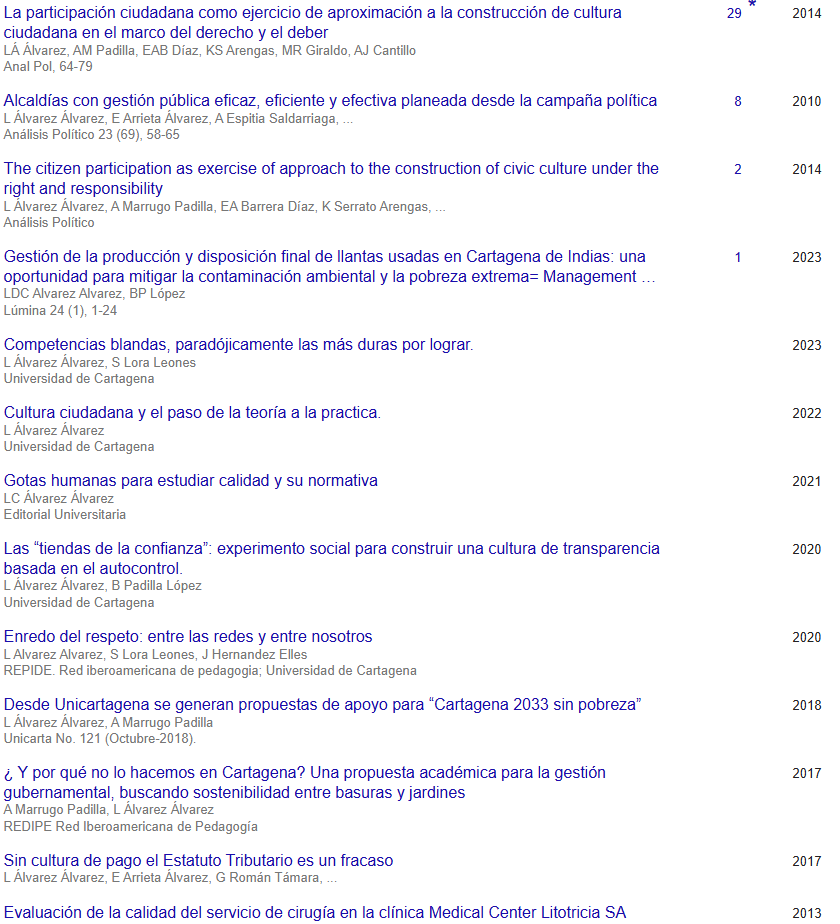 person.description | Álvarez Álvarez Lucia. Docente tiempo completo de la facultad de Química Farmacéutica de la Universidad de Cartagena. Directora del grupo Multidisciplinario El Buen Ciudadano. | |